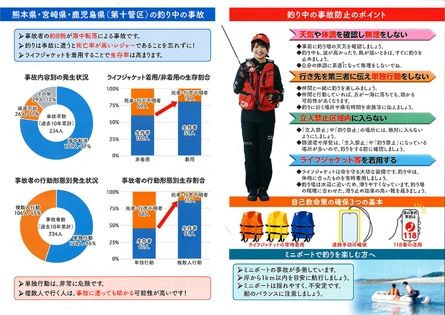 第十管区海上保安本部では、日頃から本誌などでも、海難事故防止のために、天気や体調を確認し無理をしない、行き先を第三者に伝え単独行動をしない、ライフジャケットなどを着用する等の注意喚起を行なっています。事故のないように気をつけたいです、