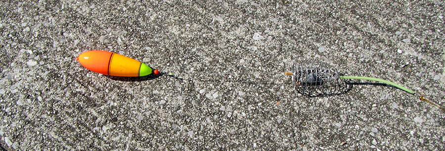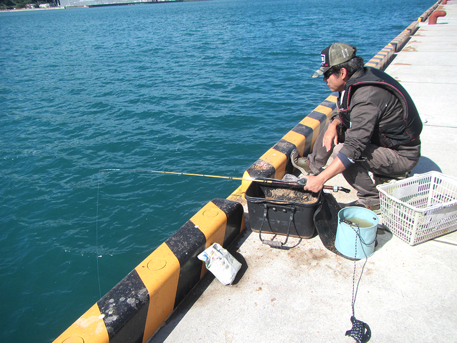ウキ下は竿1本(5m)ほど。道糸4号、クッション付きカゴ仕掛け、チヌバリ2〜3号。