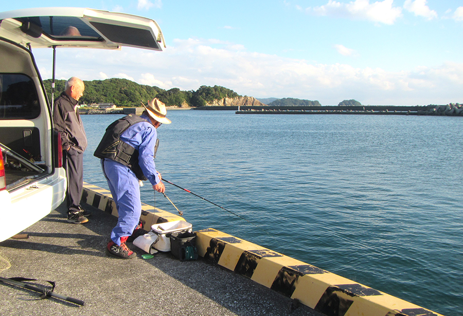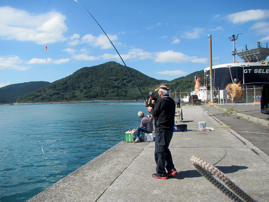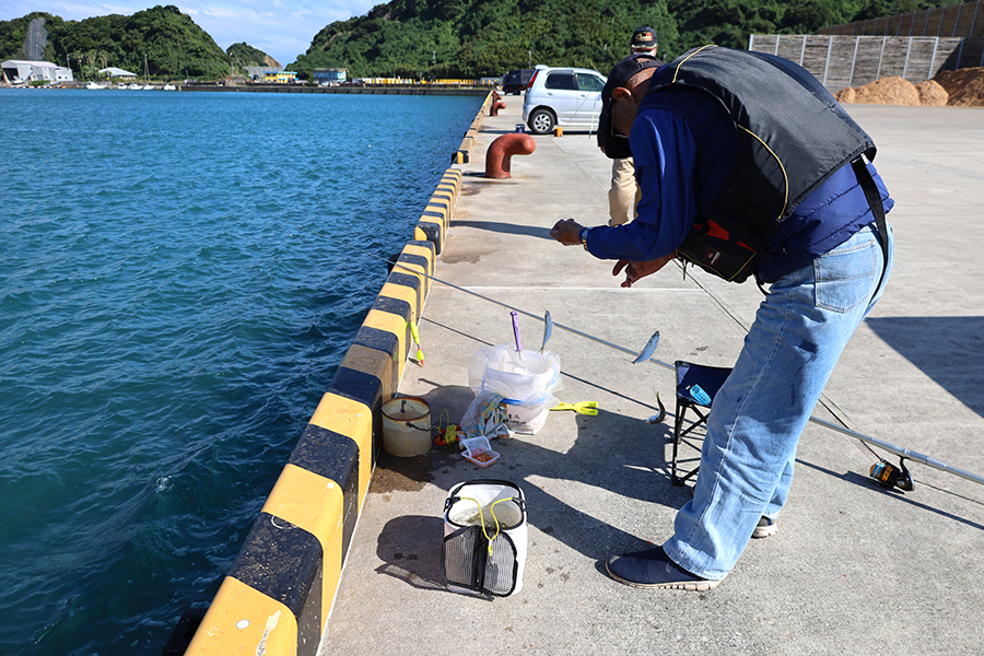 アジはちょうど満潮ごろから食い出して、釣り人は一人で入れ食いです。お昼の満潮時はけっこういい時間帯のようで、志布志港などでも同じくらいのアジがよく釣れていました。