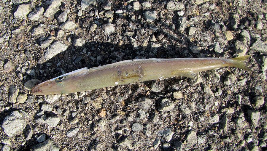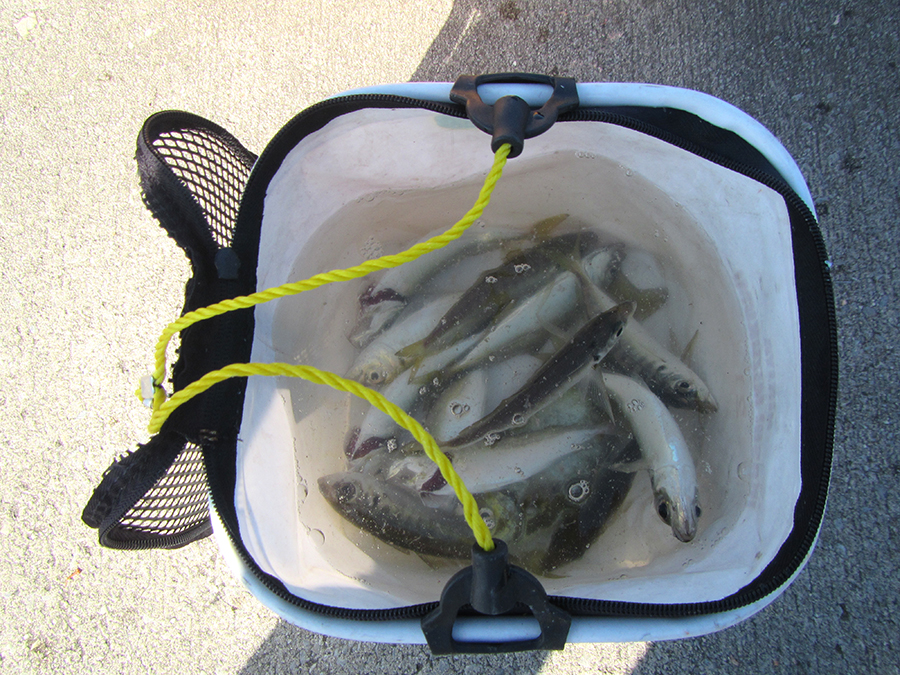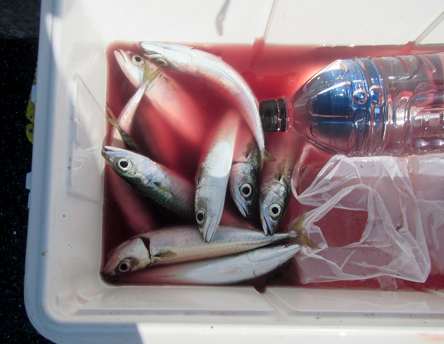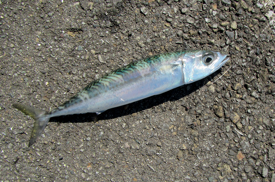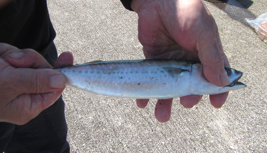 小潮で満潮がお昼の12時過ぎで、サバは満潮にかけて入れ食いで、釣り人は「初めて来て入れ食いです!」と、とてもうれしそう。20mほどの遠投で、けっこう群れが寄っていたようです。