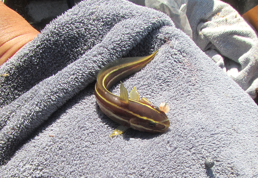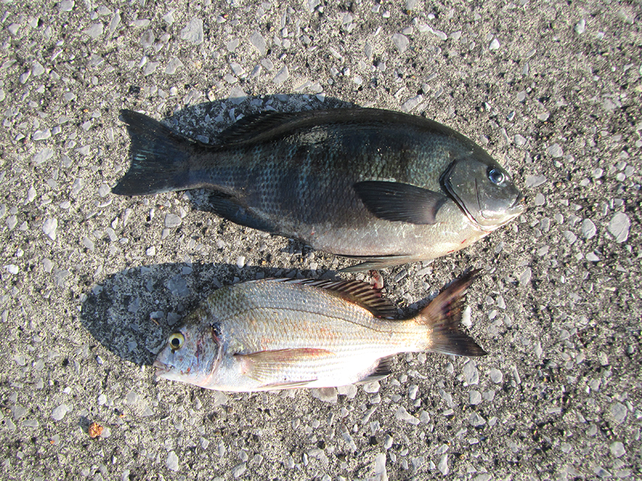また、ダゴチン釣りで、チヌの35㎝ほども釣れます。エサ盗りでゴンズイも来るので毒棘に刺されないよう注意します。ダゴチンでのチヌ狙いは流行っているようで、宮崎港などでも、けっこう人気です。