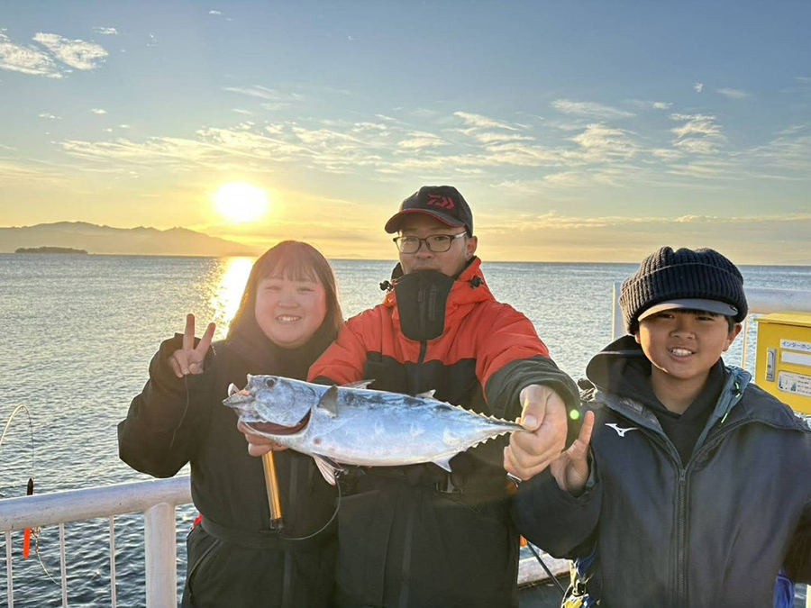 おめでとうございます。本年もよろしくお願いいたします! 南のつり 2026.01.07 1月1日、鴨池海づり公園の下げ潮の釣り座で、ウキ流しの臼杵さんのウキが沈んだ。 今年の初ヒットに緊張が走り、慎重にタモ入れをして釣り台に姿を見せたのは、40㌢のスマガツオだ。 7時20分の初日の出とドンピシャ、臼杵さんを中心に大村さん、野間口春馬君と、初日の出をバックに撮影ができた。 この後もハマチ(ヤズ)などよく釣れました。今後も期待できそうです! ブログニュース 釣り事故に注意 ワタリグロさん接岸 2025.01.03 ウナギさんがんばって!! 2025.05.27 新製品ニュース 2025.01.18 瀬々野浦 クロさん好釣!! 2025.01.07 夜釣りの釣果報告でーす🎵 2025.05.16 二枚潮(にまいじお)です 2025.01.23